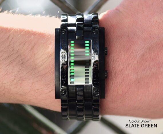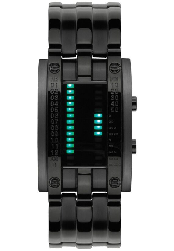 The STORM MK2 Circuit watch has a modern design and futuristic appeal. This best selling watch is made from silver and black brushed stainless steel and features a red LED vertical display that indicates the time at the press of a button. The lights on the left denote hours and AM/PM; those on the right show the minutes in tens (10-50) and single figures (1-9). Waterproof to 50m with easy change battery and date function.